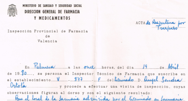 En abril de 1980, Ángel Sendra, un joven pegolino de 26 años, adquirió la licencia para ser el farmacéutico de Palmera. Para optar a aquel traspaso, sus padres habían tenido que vender huertos de naranjos, el modo de vida del padre de aquel joven.